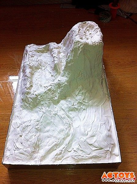 终于全部完成了。心血来潮又为超蛙做了个场景,感觉只是个玩具有点单调。先上几张场景的图(考 虑了下,场景准备做个火山配湖,被超蛙一脚把湖岸踩蹋了,形成小河) 先用石膏大概成形。