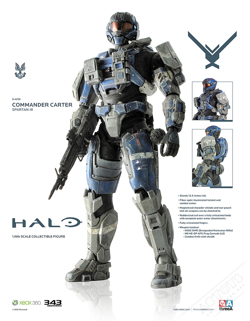 threeA 终於宣佈了HALO 系列作品发售的消息了!从之前在香港RVHK 会场展出「HALO:Reach」(光晕:致远星)的Carter-A259 与SPARTAN MKV Commando 的原型后,全球的threeA 迷都引颈期盼这一系列的大作。threeA 宣佈将於下週开始贩售SPARTAN MKV Commando 与COMMANDER CARTER SPARTAN-III。threeA 也预告在线商店限定贩售的SPARTAN MKV Commando 将会配备许多精彩的武器配件!目前只有独家在Bambalandstore 贩售,价格未定。