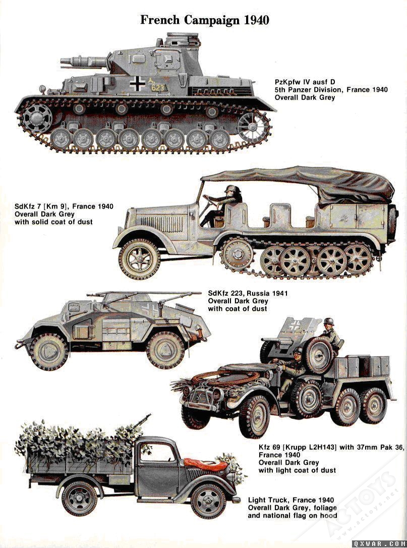 牵引车、炮兵牵引车、特殊军车、装甲车等:车辆全部使用深灰、深绿和深棕的三色迷彩暗漆。