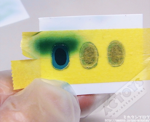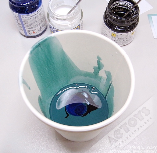 因为绿色过重,所以得用青色和黑色来弥补。而白色只要蜻蜓点水就行了。 需要注意的是,到了现在的阶段,哪怕是1滴颜料都会改变纸杯里的颜色!照片给人一种闭着眼睛乱来的感觉,但其实我只加了2滴左右,一切都是颜料化开的错。 平心而论,纸杯里的颜色变化根本无法用肉眼观察到。完全看不出和调色之前有什么区别。 只有用喷笔喷出来之后才会发现「啊!颜色不一样了!」。 (高手大概在喷涂前就知道会变成啥颜色了吧…!) 说实话,调这个可比珐琅漆困难多了。 但是…很有意思!!