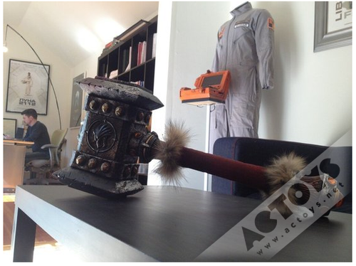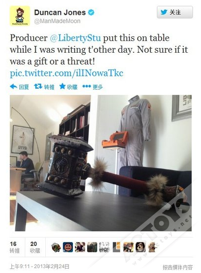 最近邓肯·琼斯在自己的推特上曝光了一张照片,并写道:“出品人Liberty Stu今天在我写作的时候把这玩意放在我的桌子上,不清楚是礼物还是个威胁!”眼尖的玩家相信能够一眼看出,这就是萨尔的宝贝“毁灭之锤”的复制品。至于Liberty Stu则是《魔兽争霸》电影的执行出品人。