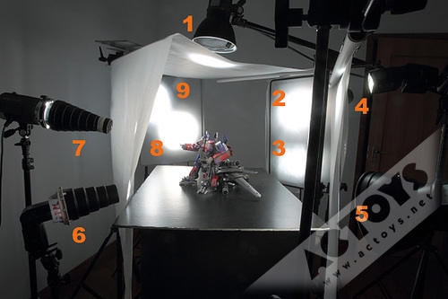 布光方面如之前的作品,需要在大致确定场景后按照的光源方向来布光。我的设定是个十字路口,有大量的橱窗和招牌的光源,然后花了5个晚上拍摄素材。机器人布光位大致类似,就是灯的数量不同,最多的是擎天柱用了9个灯,如下两图: