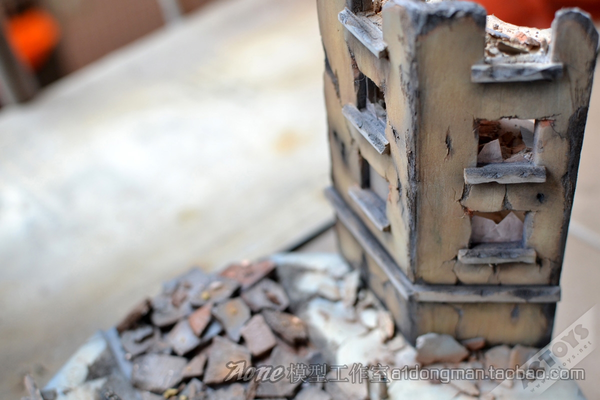 29. 建筑物的破损位置使用了灰色来表演外露的水泥墙效果,使用珐琅漆渍洗“玻璃”使其表现风尘效果。