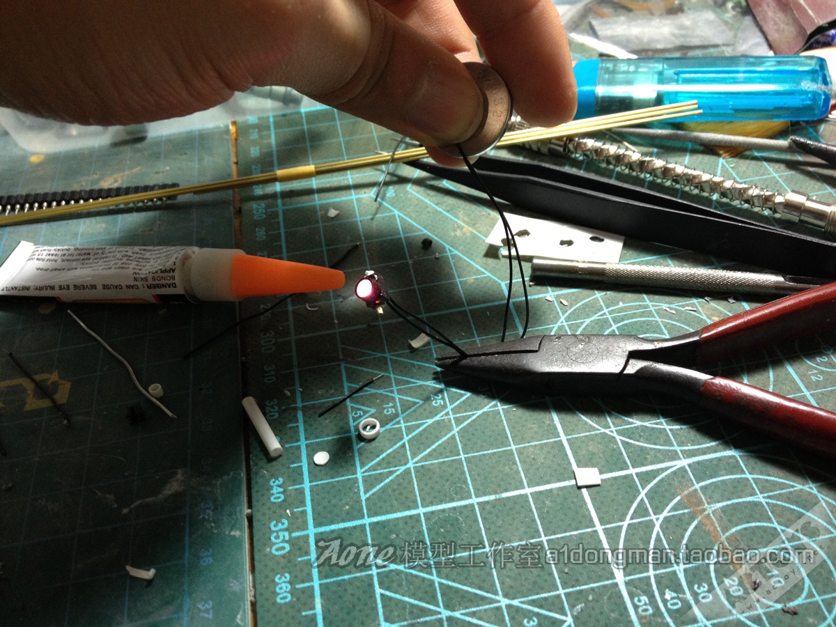 3. 扎古的眼部零件,用一截4mm外径的圆管,加上一块透明薄片,薄片内层涂一层荧光粉红。在转轴位置装上led,必须粘合,然后把眼部零件黏上,用了五爽后涂上一层黑色以遮光,初步效果如图: