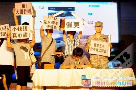 除了动漫游戏之外,活动还邀请了各方的名家前来展会与粉丝们进行互动签售。国内著名声优山新、皇贞季,著名漫画家逆光飞行、卞丽君,知名插画家黑色禁药,魔兽画家咬人,COS名家小小白、幕夜霜、幻蓝、HANABI_D,他们无一不引起了现场舞台签售的高潮,无数粉丝为其守候排队等待,由于现场签售时间不能满足所有的粉丝,但是他们的热情依然感动了现场的名家们。