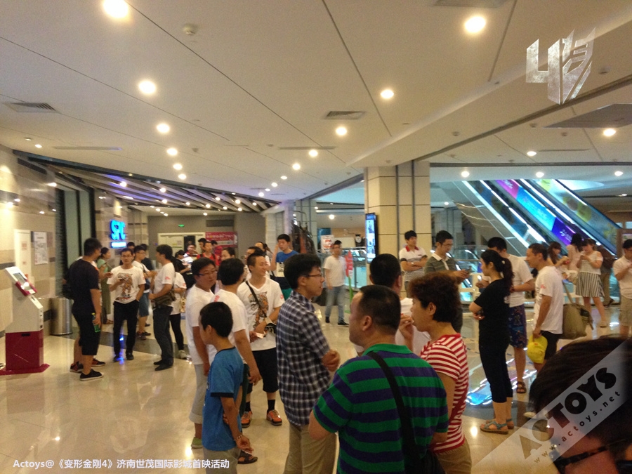 2014年6月26日夜,《变形金刚4绝迹重生》首映活动在济南世茂国际影城拉开了序幕,售票大厅人头攒动,虽然是凌晨时间,但是前来观影的热情迷友人数却并未有任何减少,热情的玩家们瞬间占领了整个售票大厅,在大厅的显眼位置也能看到AC模玩网制作的巨幅X展架,到场的AC迷友们都得到了23ing提供的