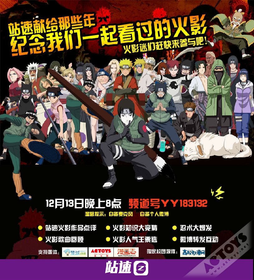 想与同好们一起分享自己的火影记忆,重拾那些美好的青春回忆吗?想欣赏那些优秀的火影作品吗?想赢取惊喜大奖,嗨翻全场吗?那就来参与我们的活动吧,记得是12月13日晚上8点,站速YY183132频道哦。热血延续,青春无悔,火影纪念盛典等你来参与!!!