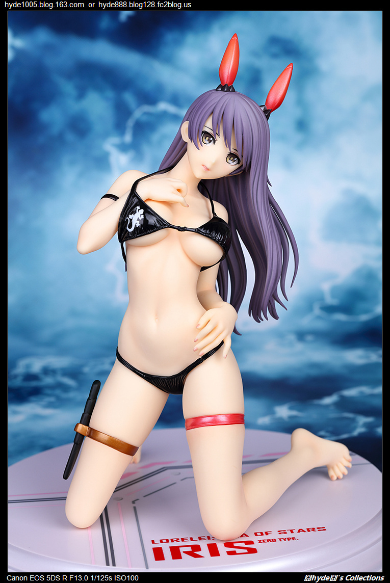 由于是同一模板缘故,她基本的造型保持不变。明显不同的是主题色调由当初纯洁的浅粉转变为神秘诱惑的紫黑。作品是以潜水为主题,Iris身穿一套性感可人的黑色比基尼,配备上一个银色的精致潜水装置Aqualung(俗称:水肺),大腿上还安置了紧急用的小匕首,确实是一位蛮专业的潜水员呢。在原型师EGG的匠心塑造之下,Iris以优雅的跪姿造型登场,左手轻靠腰间,右手则不经意地透过上着的bra带牵引住背后的水肺。细腻入神的描绘,优雅柔美的举止,让玩家欣赏到她美妙体态之余,更可领略到一种动人的诱惑之魅力。