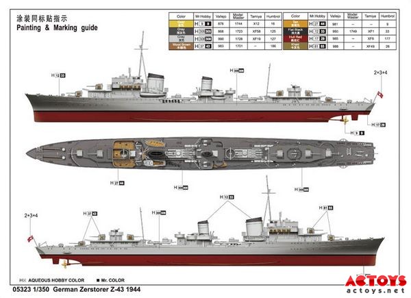 Z-43是一艘1936B型驱逐舰,于1944年3月24日服役。该级驱逐舰共有3艘服役,余下的2艘最终没有建成。1936A型驱逐舰本打算安装双联装前主炮,但由于双联装主炮没有研制好而采用单装的前主炮。当双联装主炮最终安装在驱逐舰上后,才证明双联装炮对于现有建筑结构来说太重了。加固舰首的措施并没有使适航性有较大的改善。所以1936B型将主炮更换为127mm单装炮,但因而就不适合远洋作战。该级驱逐舰仅仅在波罗的海和沿海海域执行任务。 | |||||||||||||||||||||||||||||||||