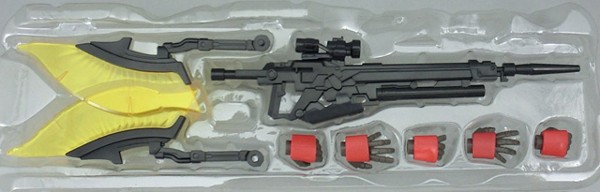 全配件图~配件包括光束步枪(可装载榴弹发射器)、光束军刀x2、光束斧x2(收纳和展开两种,光束两种)、专用盾牌x1、替换手腕装甲三块、替换用的天线、手型和连接件若干。