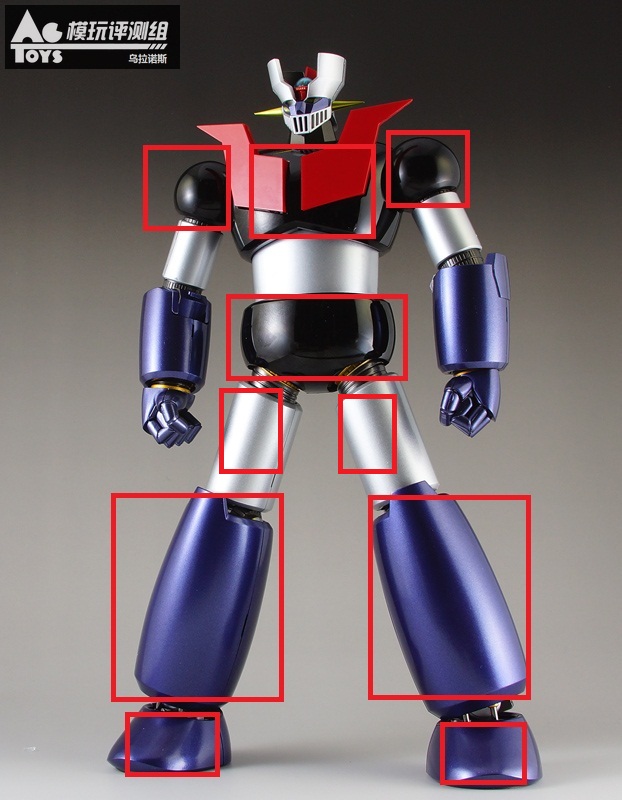 下面我们首先看一下玩具的合金件主要在哪些部位。下图中红色框部分表示是合金材质,人型正面时不包括两块红色胸甲,背面不包括脚后跟和银色大腿部分,其他合金部位正反都是一致的。这里要说一下,红色胸甲是通过吸铁石吸附在胸口的。
