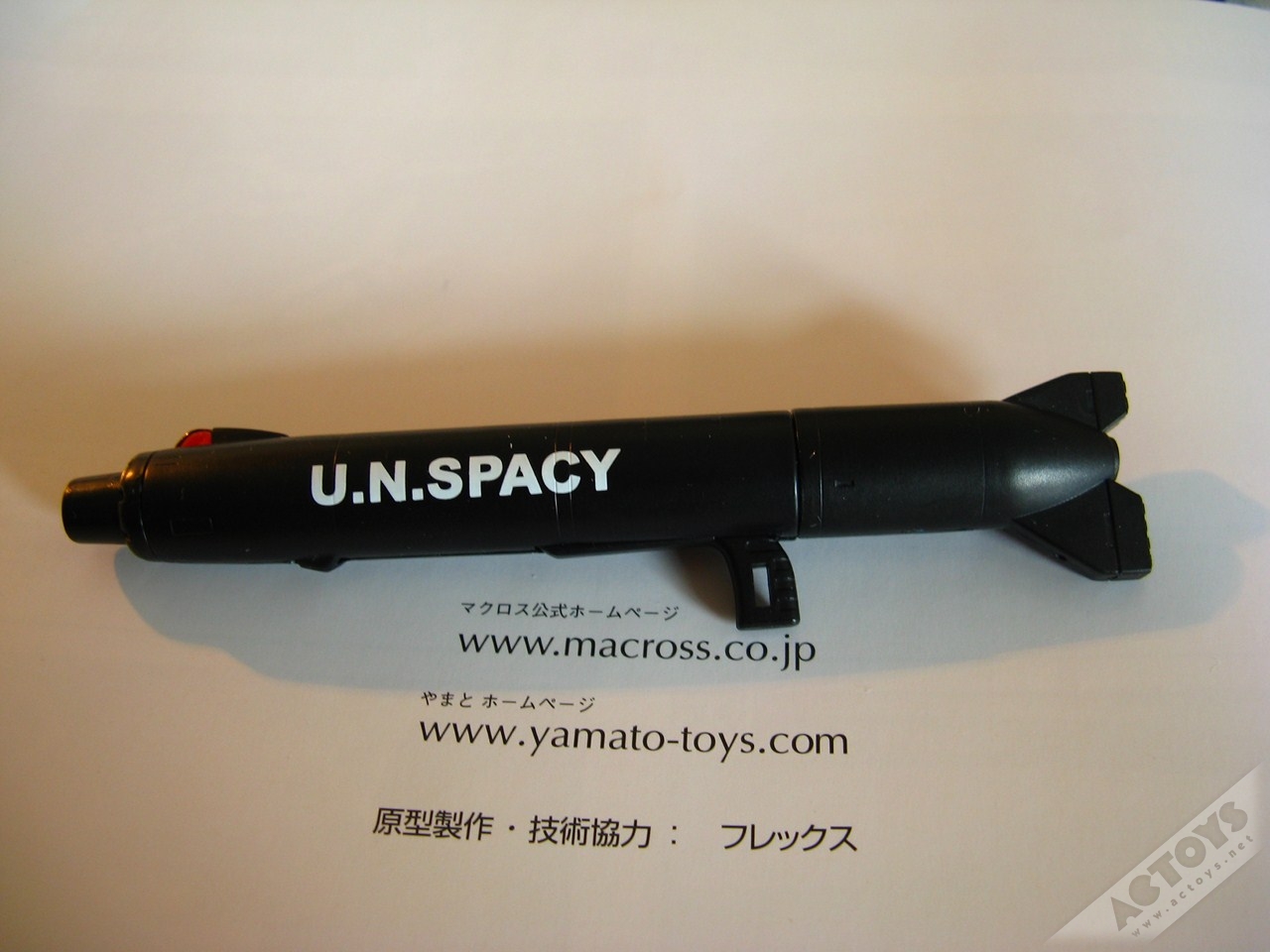 1.武器:VF-1们人手一台的手炮,看起来简单的东西却让我爱不释手,这支手炮是可以收缩拉伸的,拉伸时可以明显感觉到似乎有活塞在送力的感觉,感觉非常给力,而它的扳机也是需要拉伸才能看到的,平时是隐藏在炮身里的!(炮口瞄准镜的红点是透明的,两侧的UNSPACY涂装是上下颠倒的,这样同时照顾到了飞机形态和人形~)。另外,手炮的把手的卡槽可以挂在人形手臂上还原动画中人形状态下收纳手炮的造型。