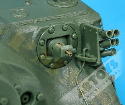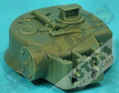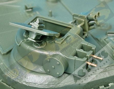 顶部机枪炮塔被开成一个单一的部分,下面有个单独的转塔架环,炮塔的顶部有铸造纹理,但侧面光滑的,在右侧转盘壁有一个相当大的铸造线需要小心剔除。炮塔后部还有一个同样脆弱的电缆线,建议同前部烟幕弹发射器电缆线一样处理。炮塔前部的两挺机枪枪管分开安装在一个机枪槽内,同样这个机枪槽与小炮塔的组合非常完美,但有粘合线需要除去。安装在上车体以后小炮塔将可以自由转动,同样也可以将枪管换为金属件以获得更好的外观。