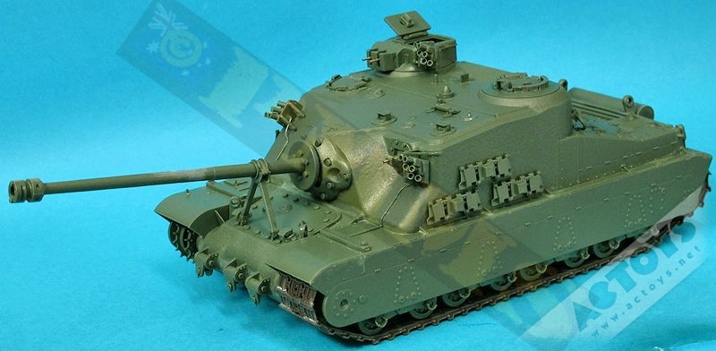 这是一个巨大的、令人印象深刻的套件,具有很好的细节表现,如上部车壳的铸造纹理和焊缝、复杂的悬挂系统,不幸的是很多小细节在组装完毕后都看不到了。套件上脱模剂过多,这点作为如今的模型套件有写不寻常,如果没有完全洗掉会影响涂装,但套件的整体组合度非常好,只是在后车体和侧裙组合时需要额外注意一些。上面提到的组合及其他问题只是个别的小问题。部分粘接线的处理会影响到零件原来的纹理,需要重新制作,但这样的地方不多;可以用一些改造件来追加细节,不过如果不加任何改造也是一款吸引人的战车模型,纵然它在大战几近结束时才以原型车的身份加入到盟军作战序列里。