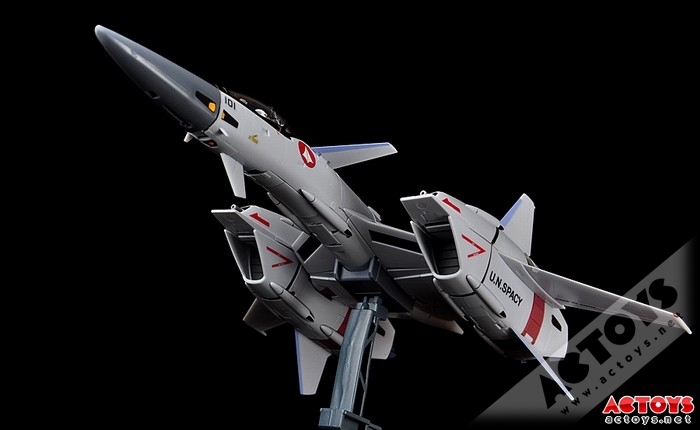 VF-4最初并未被设计成可变战机,但不能变形怎么能称为VF呢?所以另外两个形态就硬做出来了。一定有人说VF-4G的G形态太牵强,不好看,大概因为机头长手臂短的缘故会给人头重脚轻的感觉,典型的表现就是19系矮脚鸡的模样。但这只VF-4G却有一个优势就是腿长,和SV-51一样令身体比例较为平衡,感觉有点像VF-25装备SP包的G形态。手臂确实短了点,其实是因为手炮稍大遮住了小臂线条,如果VF-4G有手持光枪的话,视觉效果就会好得多了,总之,在我玩过的VF中,这只VF-4的G形态即便没有VF-1的经典,没有SV-51的嚣张,也足够帅气了,个人认为至少比19、11要强,比YF-29的臃肿也要好。G形态的变形很有新意,因为手臂和小腿都集成在SP包上,整个变形结构2/3的亮点都在这里了。在保证外形的前提下,能在如此小的空间中容纳了复杂的变形关节和肢体结构,Yamato的技术力真是深不见底!实净的合金关节手感相当赞,柔滑顺手,恰到好处的阻滞感,接头应该都是包裹了POM材料,十分耐磨的感觉,绝不像B社25系的合金关节那般不耐玩。关节设计的鬼斧神工,无法用言语表达,只是结实耐玩还不够,Y社还做到了超可动!还嫌不够?还有内置抽拉式挡板令外观无穿帮,牛逼了吧!神作了吧!