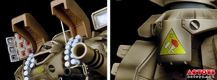 头部的天线是硬塑制,很担心会折断。绿色OD版改为金属天线并进一步锐化,可惜旧化版虽然在OD版之后发售,但与原色版一致,仍然是硬塑,把玩要小心了;左肩探照灯使用了透明件,效果类似相机闪光灯,如果再能装入LED灯就好了,毕竟身体内应该有很大的空间可以利用。