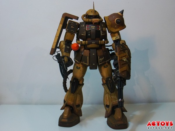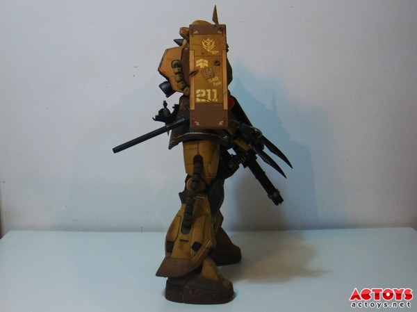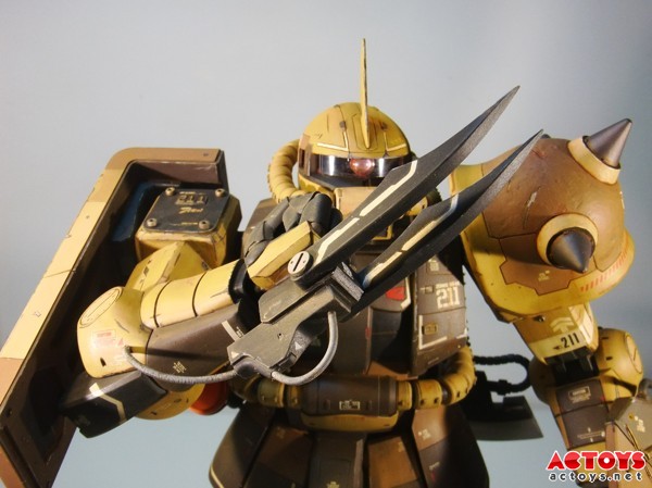 宇宙历96年,重力圈内仍旧坚持奋战的吉翁勇士在极度缺乏设备和弹药补给的条件下,自行对现有Mobile Suit进行适用改造。由于MS-06 S型的机动力略高于同系列其他型号,故对其近战能力进行了加强。手部加装可折叠的热能拳刃,热能斧刃大型化并根据联邦MS光刃的长度对斧柄进行加长。根据MS-07 B-3格林炮盾的实战评测,使用MS-07系列的75毫米速射炮弹药自行研制了对机体平衡性和机动性影响更小,弹药投射速率更高的格林炮盾牌。